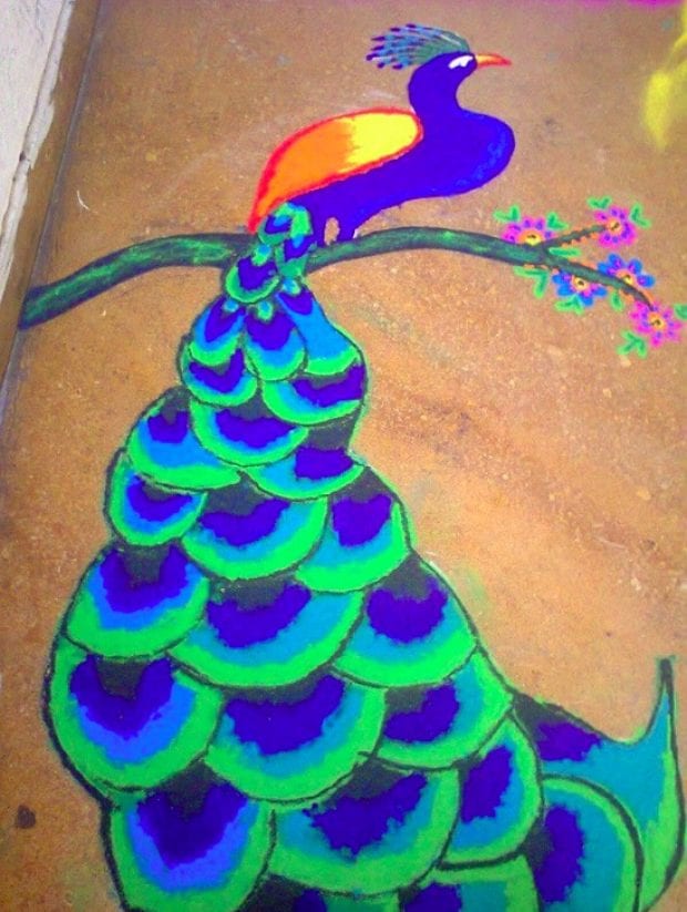 Welcome the Goddess Lakshmi into your home by making a Peacock Rangoli on your entrance of the house. A lot of people use glitter in order to make rangolis glow and look better. Here are some of the latest collection of simple peacock rangolis that can make people a novice in rangoli making. Do Check out peacock rangoli designs and various patterns for Diwali.